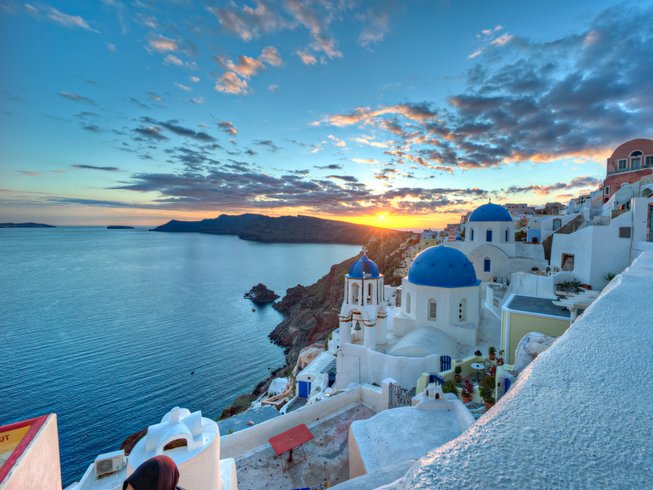 • Santorin – Vue sur la caldeira, installations de luxe, méditation au coucher du soleil