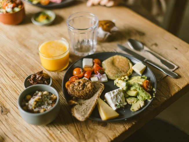 Les repas sont souvent végétariens ou végétaliens, préparés avec de l'huile d'olive locale, des amandes, des tomates et des herbes du jardin.